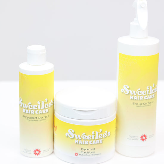 3 step easy process to getting the most silkiest silk press you can get at home! With 3 easy products to use Peppermint Shampoo, Peppermint Conditioner, and the star of show the Press Me Pretty Serum. Look out for your email for an in depth tutorial on how to get the best out of these products. All bundles comes with an 8oz Press Me Pretty Serum. Check email for full tutorial on how to use the products.